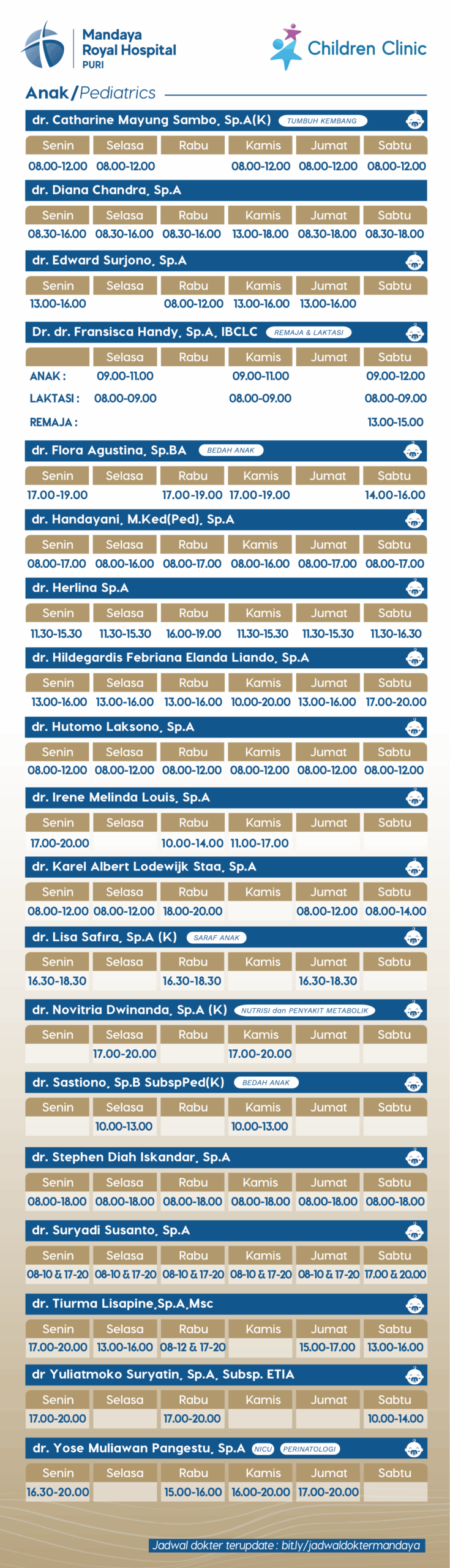 Buat Janji Dokter Profile Dokter dr. Catharine Mayung Sambo, Sp.A(K) dr. Diana Chandra, Sp.A dr. Edward Surjono, Sp.A dr. Flora Agustina, Sp.BA Dr. dr. Fransisca Handy Agung, Sp.A, IBCLC dr. Handayani, Sp.A dr. Herlina. Sp.A dr. Hildegardis Febrina Elanda Liando, Sp.A dr. Hutomo Laksono, Sp.A dr. Irene Melinda Louis Sp.A dr. Karel Albert Lodewijk Staa, Sp.A dr. Lisa Safira, Sp.A (K) dr. Novitria Dwinanda, Sp.A (K) dr. Sastiono, Sp.B, Subsp.Ped(K) dr. Stephen Diah Iskandar, Sp.A dr. Suryadi Susanto, Sp.A dr. Tiurma Lisapine Pangaribuan, Sp.A, MSc dr. Yose Muliawan Pangestu, Sp.A dr. Yuliatmoko Suryatin, Sp.A Buat Janji Dokter Kembali Ke Jadwal Download Care Doctor