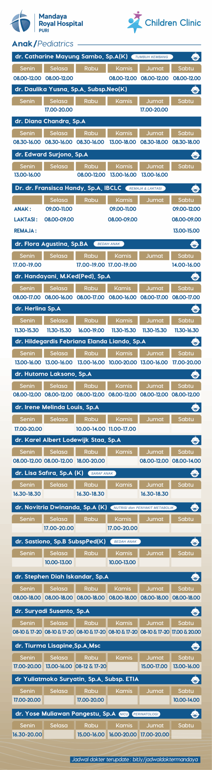 Buat Janji Dokter Profile Dokter dr. Catharine Mayung Sambo, Sp.A(K) dr. Daulika Yusna, Sp.A, Subsp.Neo(K) dr. Diana Chandra, Sp.A dr. Edward Surjono, Sp.A dr. Flora Agustina, Sp.BA Dr. dr. Fransisca Handy Agung, Sp.A, IBCLC dr. Handayani, Sp.A dr. Herlina. Sp.A dr. Hildegardis Febrina Elanda Liando, Sp.A dr. Hutomo Laksono, Sp.A dr. Irene Melinda Louis Sp.A dr. Karel Albert Lodewijk Staa, Sp.A dr. Lisa Safira, Sp.A (K) dr. Novitria Dwinanda, Sp.A (K) dr. Sastiono, Sp.B, Subsp.Ped(K) dr. Stephen Diah Iskandar, Sp.A dr. Suryadi Susanto, Sp.A dr. Tiurma Lisapine Pangaribuan, Sp.A, MSc dr. Yose Muliawan Pangestu, Sp.A dr. Yuliatmoko Suryatin, Sp.A Buat Janji Dokter Kembali Ke Jadwal Download Care Doctor