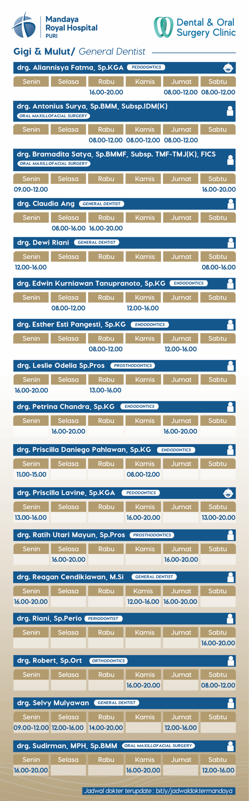 Buat Janji Dokter Profile Dokter drg. Aliannisya Fatma, Sp. KGA drg. Antonius Surya, SpBM drg. Bramadita Satya, SpBM drg. Claudia Ang drg. Dewi Riani drg. Edwin Kurniawan Tanupranoto, Sp.KG drg. Esther Esti Pangesti, Sp.KG drg. Petrina Chandra, Sp.KG drg Leslie Odelia Sp.Pros drg. Priscilla Daniego Pahlawan, Sp.KG drg. Priscilla Lavine, Sp.KGA drg. Ratih Utari Mayun, Sp.Pros drg. Reagan Cendikiawan, M.Si drg. Riani, Sp.Perio drg. Robert, Sp.Ort drg. Selvy Mulyawan drg. Sudirman, MPH, Sp.BMM Buat Janji Dokter Kembali Ke Jadwal Download Care Doctor