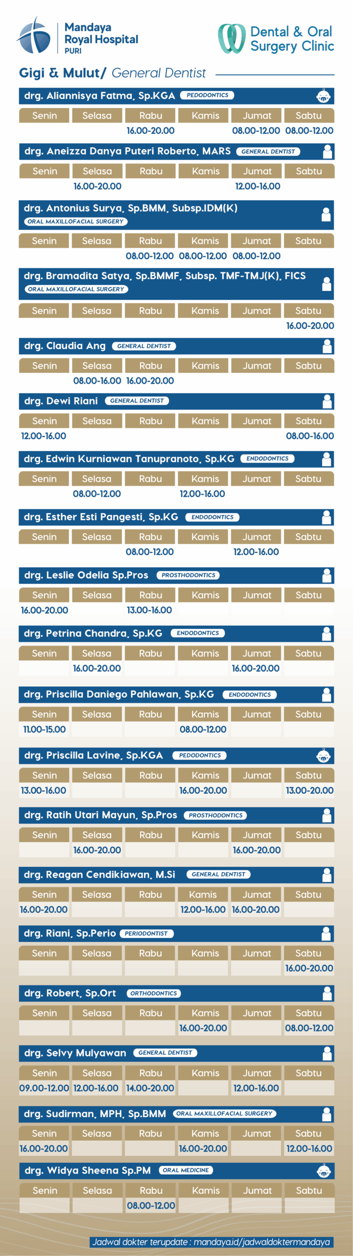 Buat Janji Dokter Profile Dokter drg. Aliannisya Fatma, Sp. KGA drg. Antonius Surya, SpBM drg. Aneizza Danya Puteri Roberto, MARS drg. Bramadita Satya, SpBM drg. Claudia Ang drg. Dewi Riani drg. Edwin Kurniawan Tanupranoto, Sp.KG drg. Esther Esti Pangesti, Sp.KG drg. Petrina Chandra, Sp.KG drg Leslie Odelia Sp.Pros drg. Priscilla Daniego Pahlawan, Sp.KG drg. Priscilla Lavine, Sp.KGA drg. Ratih Utari Mayun, Sp.Pros drg. Reagan Cendikiawan, M.Si drg. Riani, Sp.Perio drg. Robert, Sp.Ort drg. Selvy Mulyawan drg. Sudirman, MPH, Sp.BMM drg. Widya Sheena Sp.PM Buat Janji Dokter Kembali Ke Jadwal Download Care Doctor