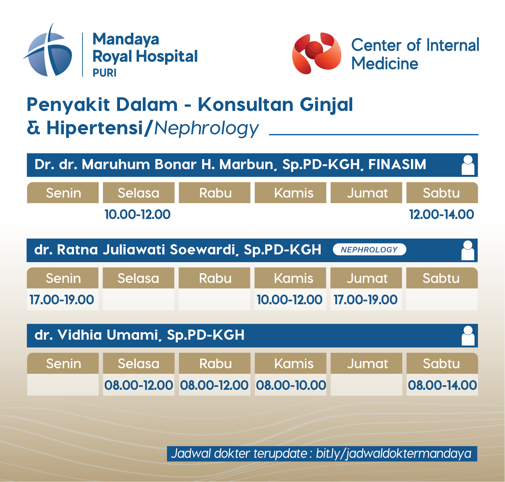 Buat Janji Dokter Profile Dokter Dr. dr. Maruhum Bonar H. Marbun, Sp.PD-KGH, FINASIM dr. Ratna Juliawati Soewardi, SpPD-KGH dr. Vidhia Umami, SpPD-KGH Buat Janji Dokter Kembali Ke Jadwal Download Care Doctor