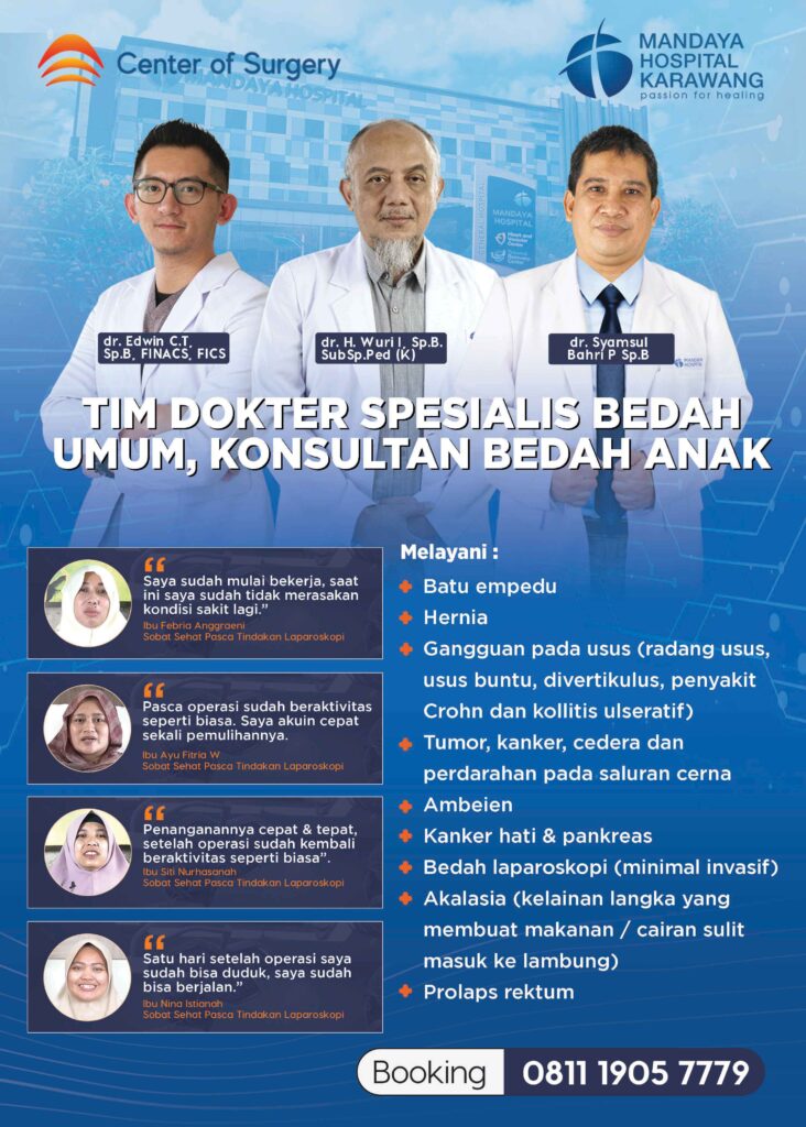 Selain menghadirkan layanan dokter bedah anak, Mandaya Hospital Karawang juga memiliki tim dokter bedah umum lainnya yang kompeten dan berpengalaman di bidangnya. Para dokter ini siap memberikan penanganan terbaik untuk berbagai kondisi, mulai dari kasus bedah minor hingga prosedur bedah kompleks pada saluran pencernaan.
