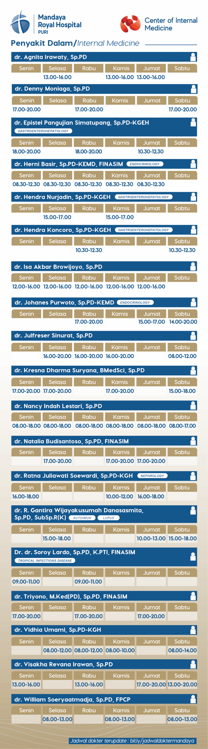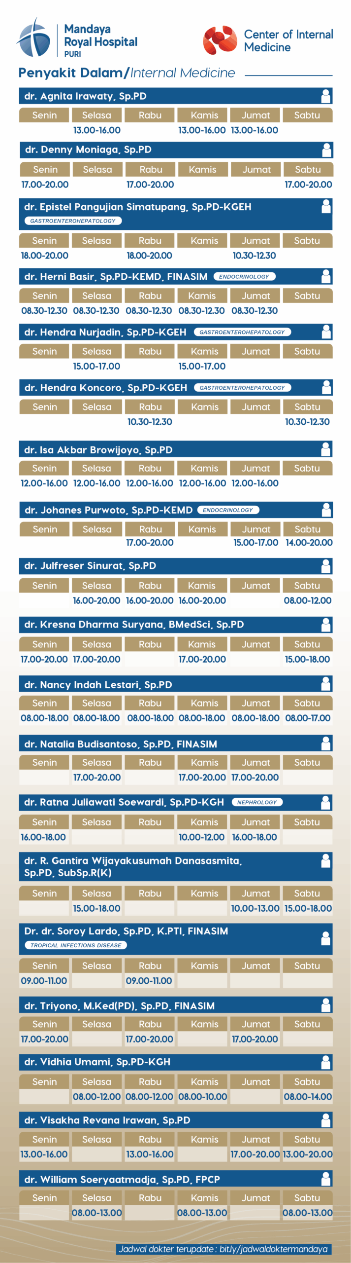 Buat Janji Dokter Profile Dokter dr. Agnita Irawaty, Sp.PD dr. Denny Moniaga, Sp.PD dr. Epistel Pangujian Simatupang, Sp.PD-KGEH dr. Herni Basir, Sp.PD.KEMD. FINASIM dr. Hendra Nurjadin, Sp.PD-KGEH dr. Hendra Koncoro, Sp.PD-KGEH dr. Isa Akbar Browijoyo, Sp.PD dr. Johanes Purwoto, Sp.PD-KEMD dr. Julfreser Sinurat, Sp.PD dr. Kresna Dharma Suryana, BMedSci, Sp.PD dr. Nancy Indah Lestari, Sp.PD dr. Natalia Budisantoso, Sp.PD, FINASIM dr. Ratna Juliawati Soewardi, SpPD-KGH dr. R Gantira Wijayakusumah Danasasmita, Sp.PD, SubSp.R(K) DR. dr. Soroy Lardo,Sp.PD, K.PTI, FINASIM dr. Triyono, M.Ked(PD), Sp.PD, FINASIM dr. Visakha Revana Irawan, Sp.PD dr. Vidhia Umami, SpPD-KGH dr. William Soeryaatmadja, SpPD, FPCP Buat Janji Dokter Kembali Ke Jadwal Download Care Doctor