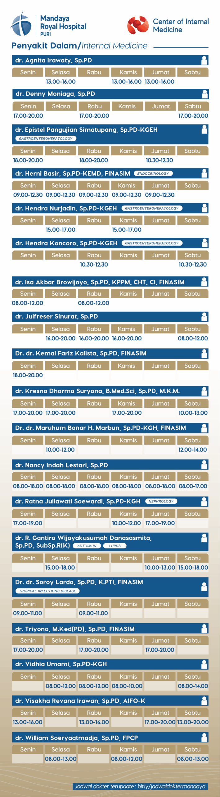 Buat Janji Dokter Profile Dokter dr. Agnita Irawaty, Sp.PD dr. Denny Moniaga, Sp.PD dr. Epistel Pangujian Simatupang, Sp.PD-KGEH dr. Herni Basir, Sp.PD.KEMD. FINASIM dr. Hendra Nurjadin, Sp.PD-KGEH dr. Hendra Koncoro, Sp.PD-KGEH dr. Isa Akbar Browijoyo, Sp.PD, KPPM, CHT, CI,FINASIM dr. Julfreser Sinurat, Sp.PD dr. Kresna Dharma Suryana, B.Med.Sci, Sp.PD, M.K.M Dr. dr. Maruhum Bonar H. Marbun, Sp.PD-KGH, FINASIM dr. Nancy Indah Lestari, Sp.PD dr. Ratna Juliawati Soewardi, SpPD-KGH dr. R Gantira Wijayakusumah Danasasmita, Sp.PD, SubSp.R(K) DR. dr. Soroy Lardo,Sp.PD, K.PTI, FINASIM dr. Triyono, M.Ked(PD), Sp.PD, FINASIM dr. Visakha Revana Irawan, Sp.PD, AIFO-K dr. Vidhia Umami, SpPD-KGH dr. William Soeryaatmadja, SpPD, FPCP Buat Janji Dokter Kembali Ke Jadwal Download Care Doctor