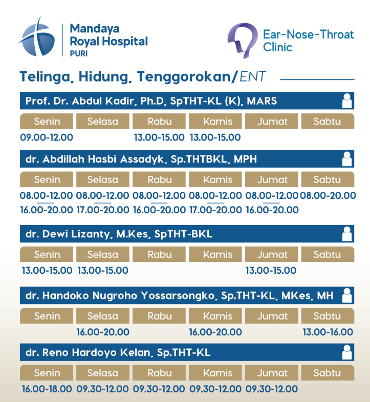 Buat Janji Dokter Profile Dokter Prof. Dr. Abdul Kadir, Ph.D, SpTHT-BKL (K) dr. Abdillah Hasbi Assadyk, SpTHT-KL dr. Dewi Lizanty, M.Kes, SpTHT-BKL dr. Handoko Nugroho Yossarsongko, Sp.THT-KL, MKes dr. Reno Hardoyo Kelan, Sp.THT-KL Buat Janji Dokter Kembali Ke Jadwal Download Care Doctor