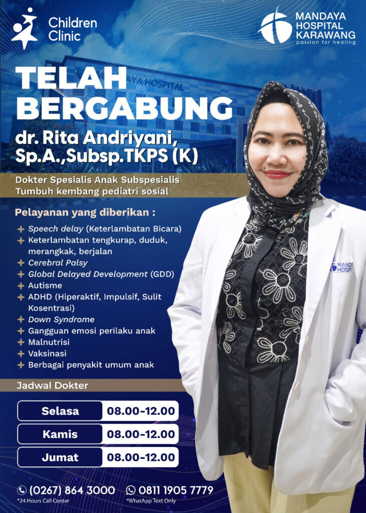 Kini, orang tua di Karawang tidak perlu jauh mencari layanan terpercaya, karena RS Mandaya Karawang menghadirkan layanan tumbuh kembang anak yang lengkap dan terpadu di Karawang, ditangani langsung oleh dr. Rita Andriyani, Sp.A., Subsp.TKPS (K), Dokter Spesialis Anak Subspesialis Tumbuh Kembang Pediatri Sosial.