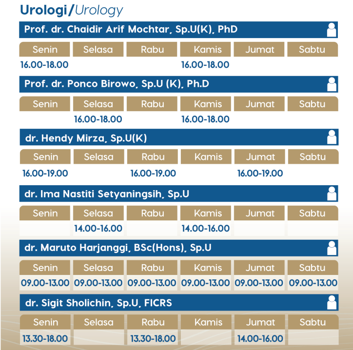 Buat Janji Dokter Profile Dokter Prof. dr. Chaidir Arif Mochtar, Sp.U(K), PhD Prof. dr. Ponco Birowo, Sp.U (K), Ph.D dr. Hendy Mirza, Sp.U(K) dr. Ima Nastiti Setyaningsih, Sp.U dr. Maruto Harjanggi, BSc(Hons), Sp.U dr. Sigit Sholichin, Sp.U, FICRS Buat Janji Dokter Kembali Ke Jadwal Download Care Doctor