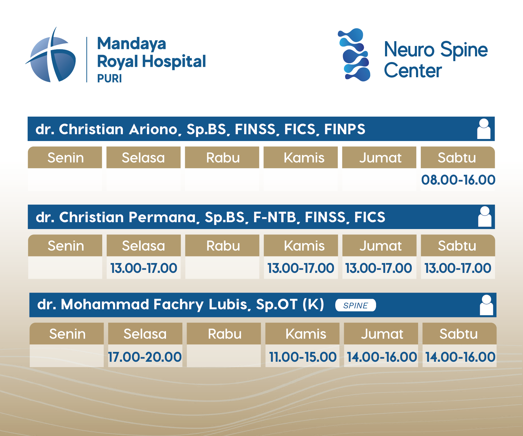 Buat Janji Dokter Profile Dokter dr. Christian Ariono, Sp.BS, FINSS, FICS, FINPS dr. Christian Permana,SpBS, F-NTB, FINSS, FICS dr. Mohammad Fachry Lubis, Sp.OT (K) Spine Buat Janji Dokter Kembali Ke Jadwal Download Care Doctor