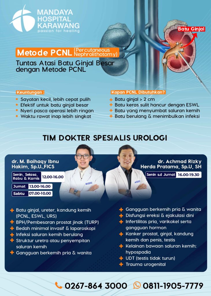 dr. Achmad Rizki Herda P. Sp.U , dan dr. Muhammad Baihaqy Ibnu Hakim, Sp.U.,FICS adalah dokter spesialis urologi Mandaya Hospital Karawang siap membantu Anda menemukan solusi medis yang tepat, aman, dan nyaman, salah satunya dengan metode penanganan non-bedah yang efektif dan minim risiko yakni melalui tindakan URS (Ureterorenoskopi).