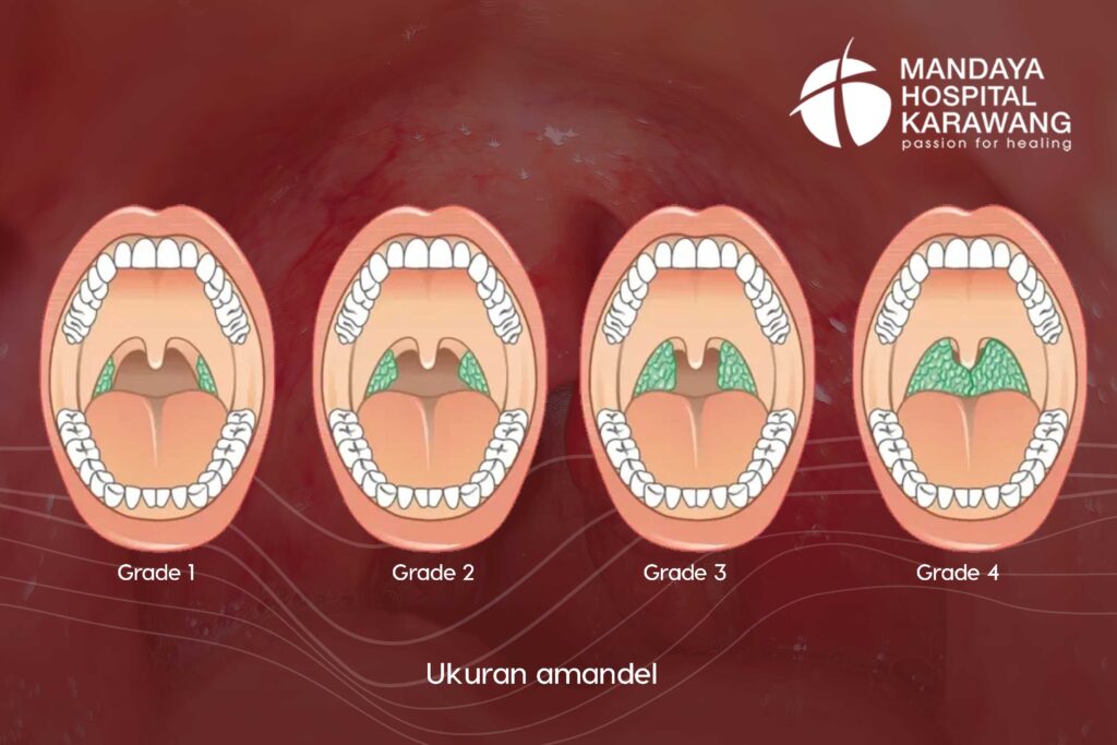 Pembesaran amandel yang signifikan dapat membuat ruang tenggorokan sempit. Tandanya antara lain: Suara seperti “mendem”, terasa sulit menelan, mudah tersedak, perubahan suara atau cara bernapas. Pada grade 4, amandel bahkan bisa hampir saling menempel di tengah.