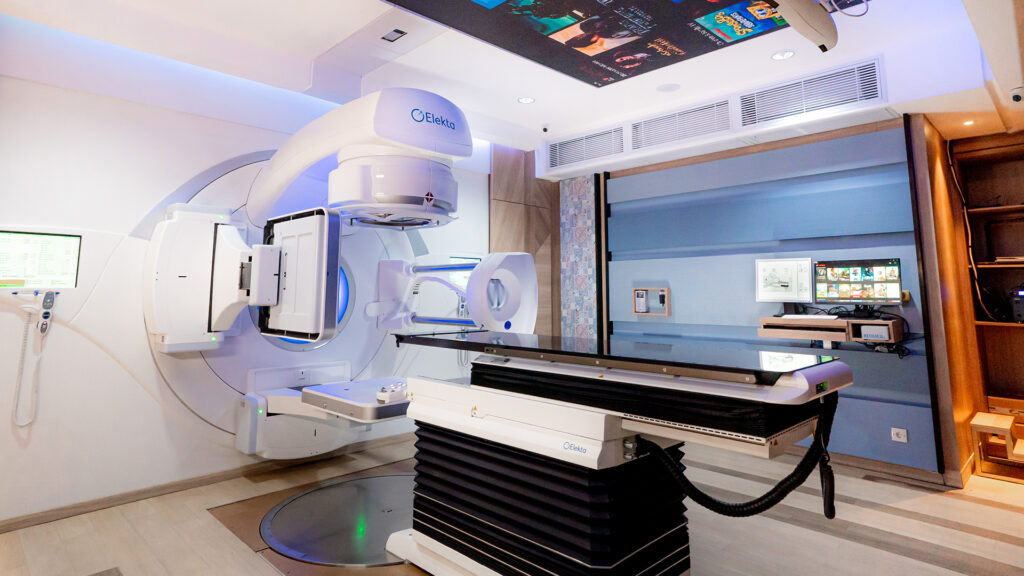During radiotherapy, you will lie on a special table while a machine moves around your body, directing precise beams of radiation to targeted areas.