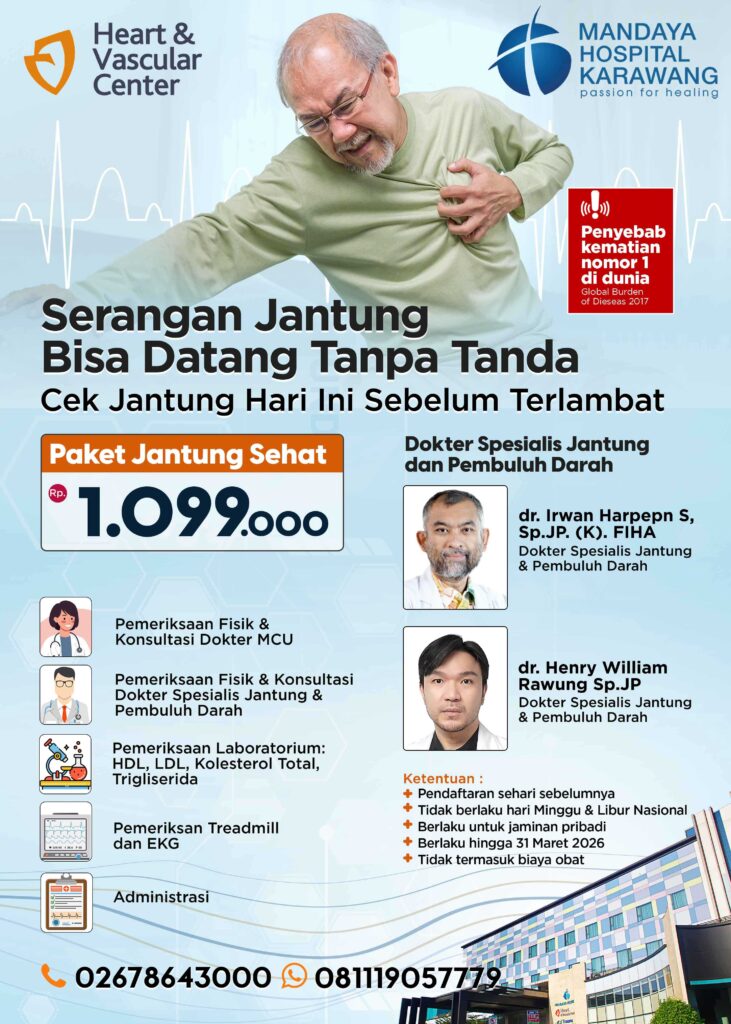 RS Mandaya Hospital Karawang menghadirkan Paket MCU Jantung Sehat sebagai solusi pemeriksaan menyeluruh untuk membantu mendeteksi risiko penyakit jantung sejak dini, sebelum menimbulkan komplikasi berbahaya.