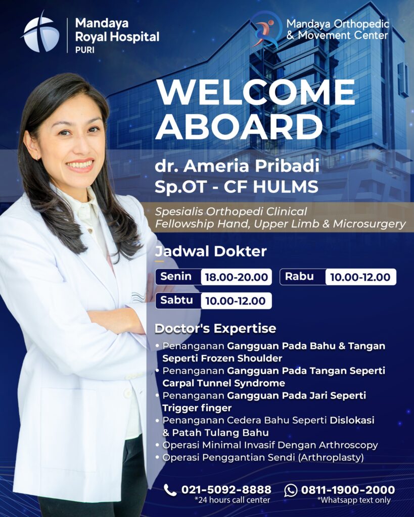 If you live in Jakarta or Tangerang and are looking for an experienced and highly skilled female orthopedic specialist, you can now consult with dr. Ameria Pribadi, Sp.OT, an orthopedic surgeon practicing at Mandaya Royal Hospital Puri.