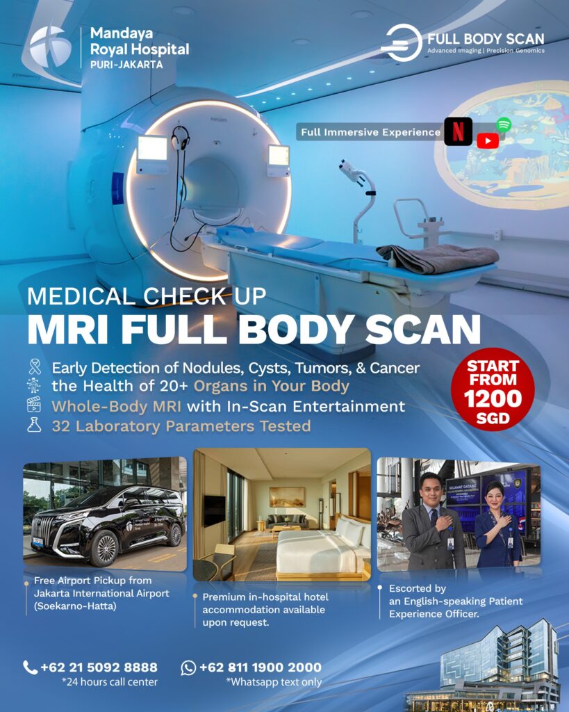Mandaya Royal Hospital Puri is offering a Special Promotion for Singapore Residents who are seeking a comprehensive and premium MRI Full Body Scan for early disease detection and preventive health screening.